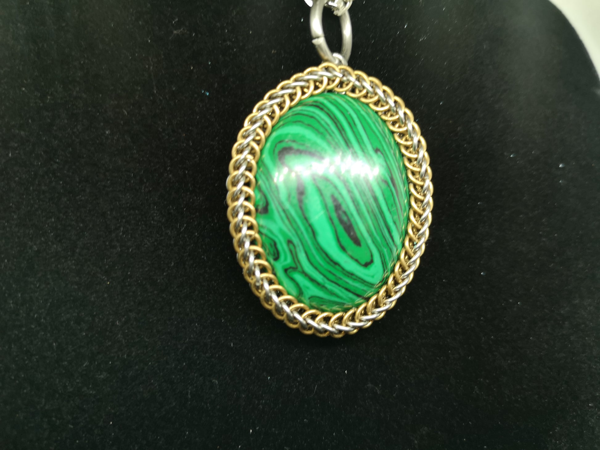 A beautiful green stone pendants wrapped in brass and stainless steel chainmail.